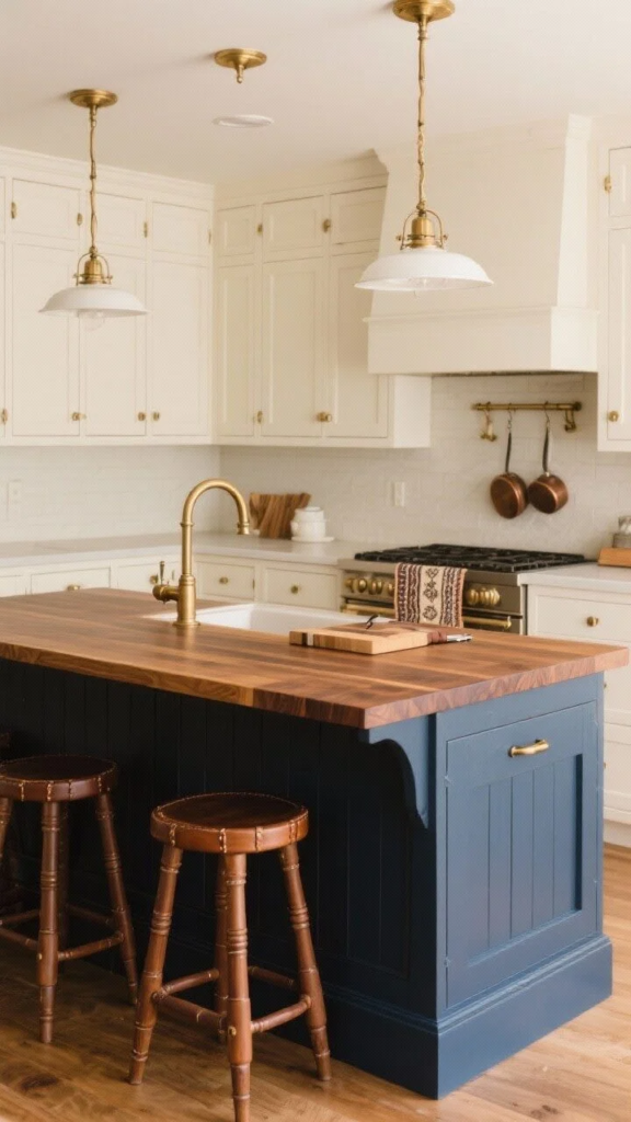 Layer brushed brass hardware, schoolhouse pendants, and leather strap stools. Keep a pot filler and a vintage runner for a lived-in look.