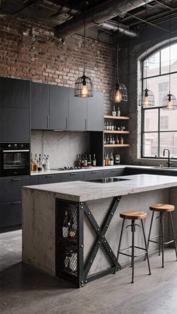 Bring in charcoal cabinetry, exposed brick, and pendants with caged bulbs. Finish with metal stools and warm oak shelves to soften the edge.