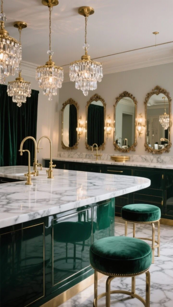 Add antique mirror panels on the stool side to bounce light and pair with crystal-trim pendants. Velvet upholstered stools and polished brass fixtures complete the mood.