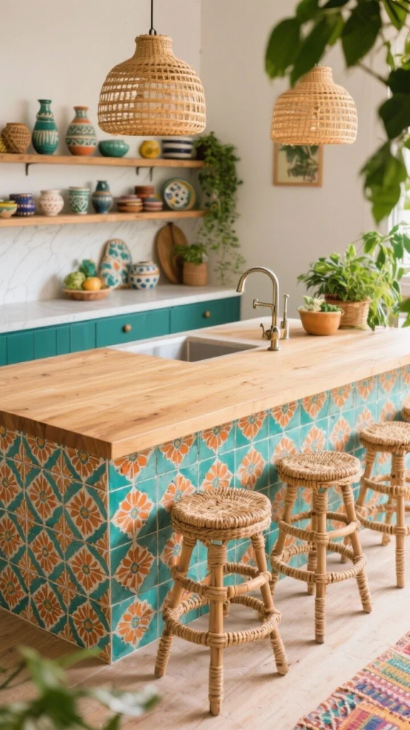 Layer rattan pendants, open shelves with ceramics, and mixed metal hardware. Use stacked counter stools with woven seats and add plants everywhere.
