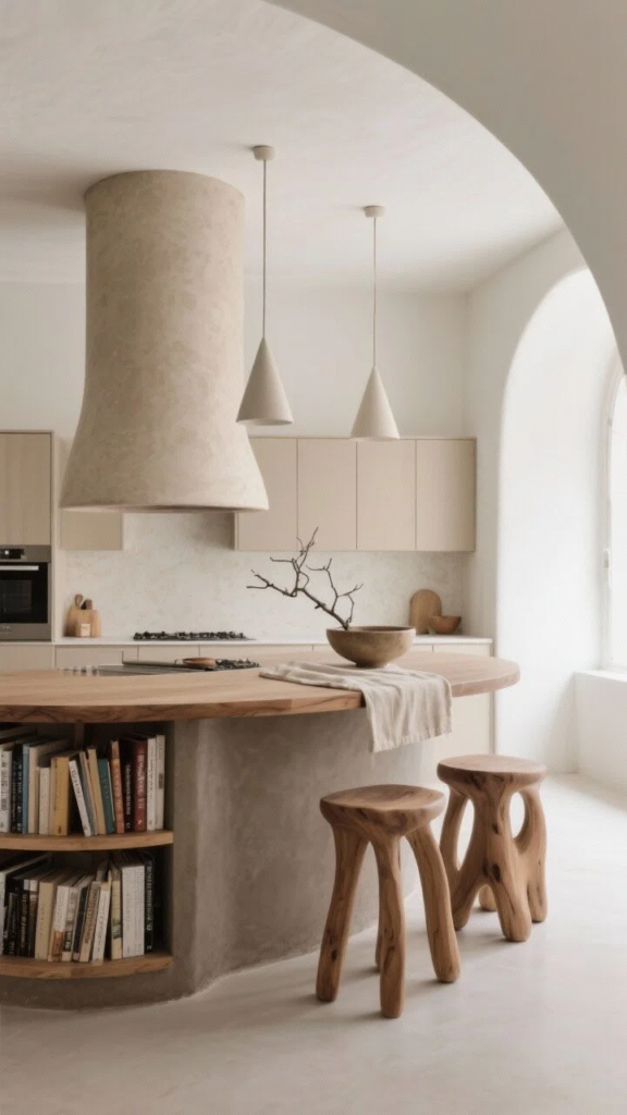 Soften the space with a curved island in warm taupe microcement and a rounded oak overhang that hugs three sculptural stools. The shape keeps traffic flowing and feels calm.