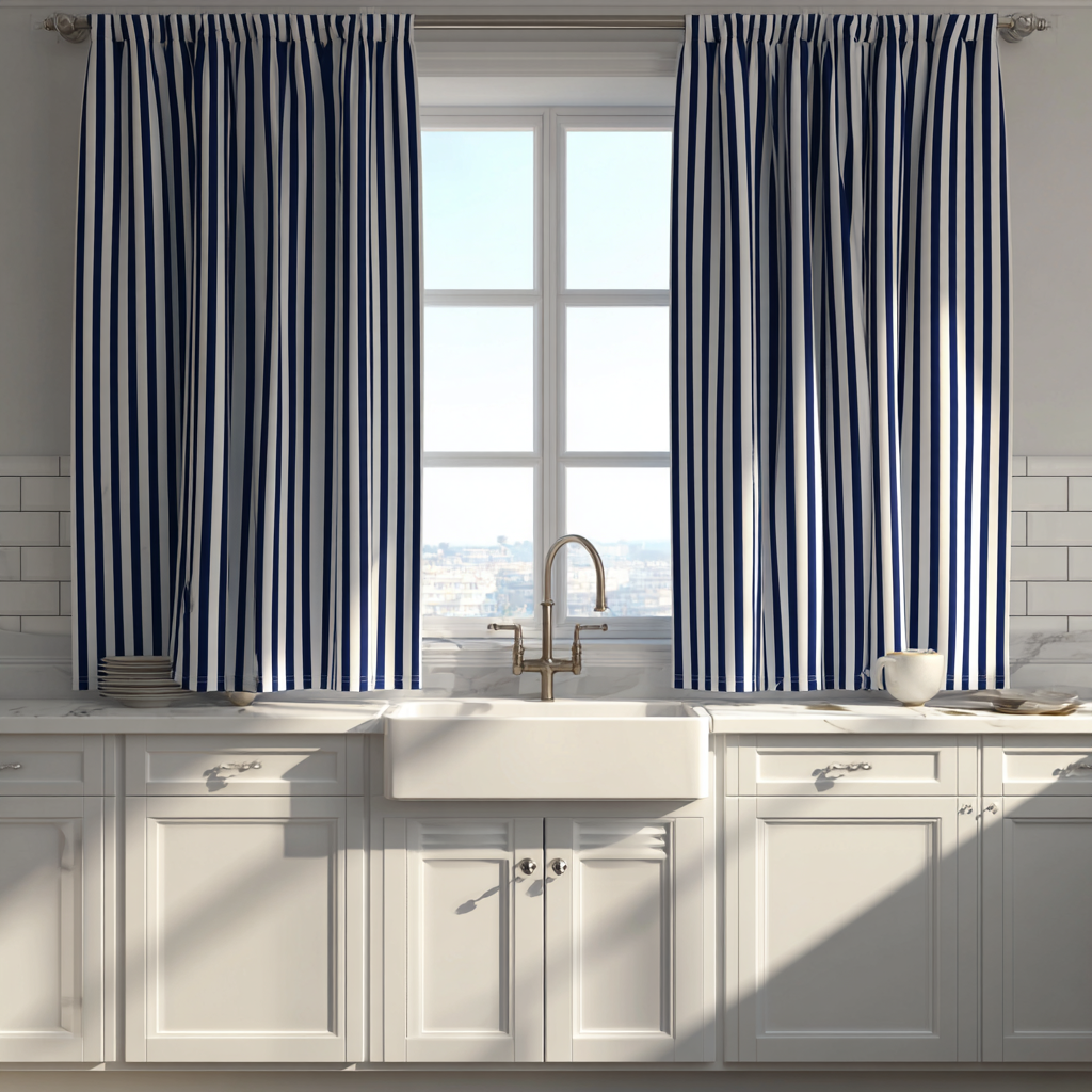 Striped cotton curtains give your kitchen a clean, crisp, nautical touch. Vertical stripes make the area look taller, while horizontal stripes add width. Handy little trick, right?