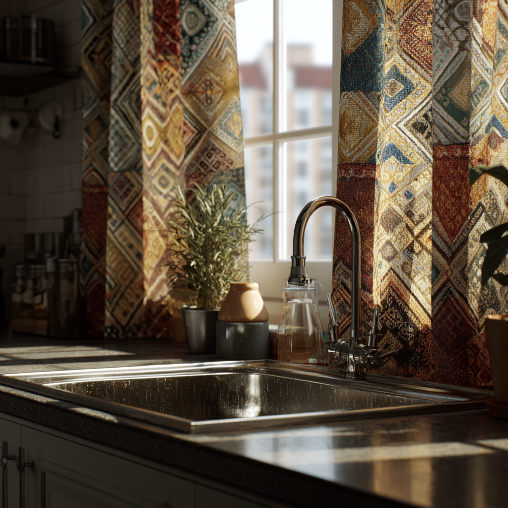 A boho curtain with playful patterns and warm tones adds energy to your sink area. Think mandalas, geometric shapes, or ethnic prints. It turns a basic kitchen into something vibrant and full of personality.