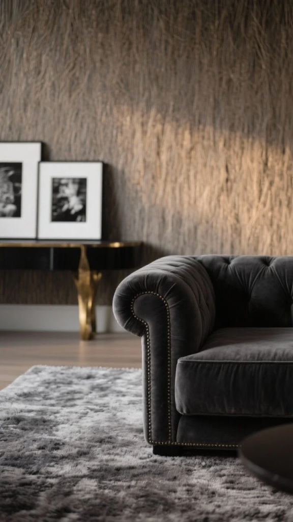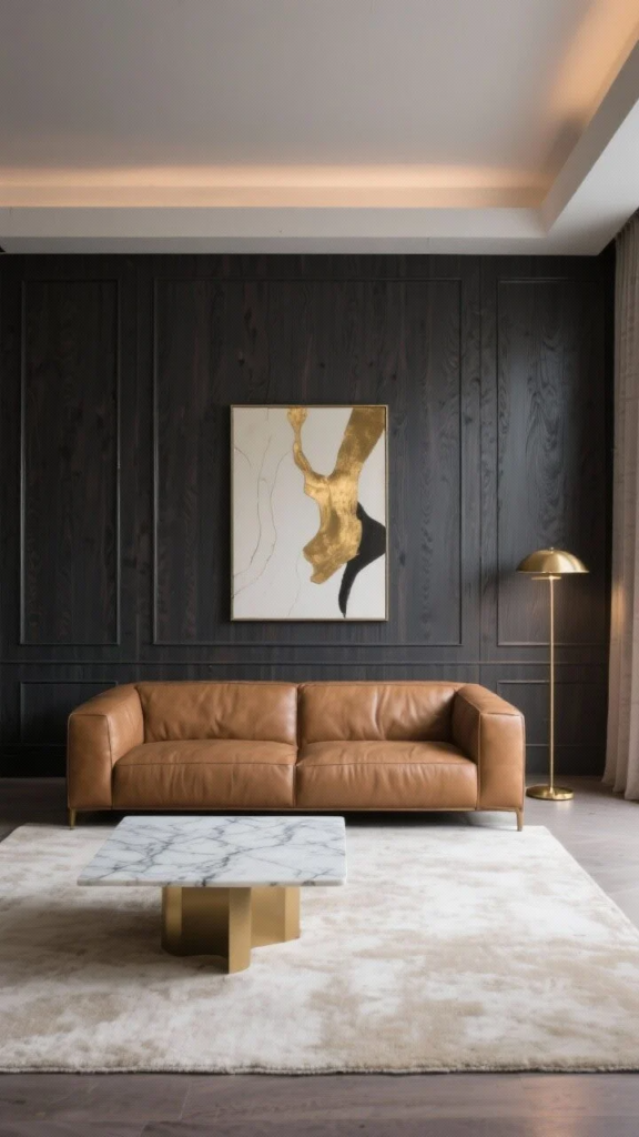 Pair it with a camel leather sofa, a slim brass floor lamp, and a marble-topped coffee table. Keep the rug light—ivory or oatmeal—to balance the depth, and add an abstract print with hints of gold for just enough shine.