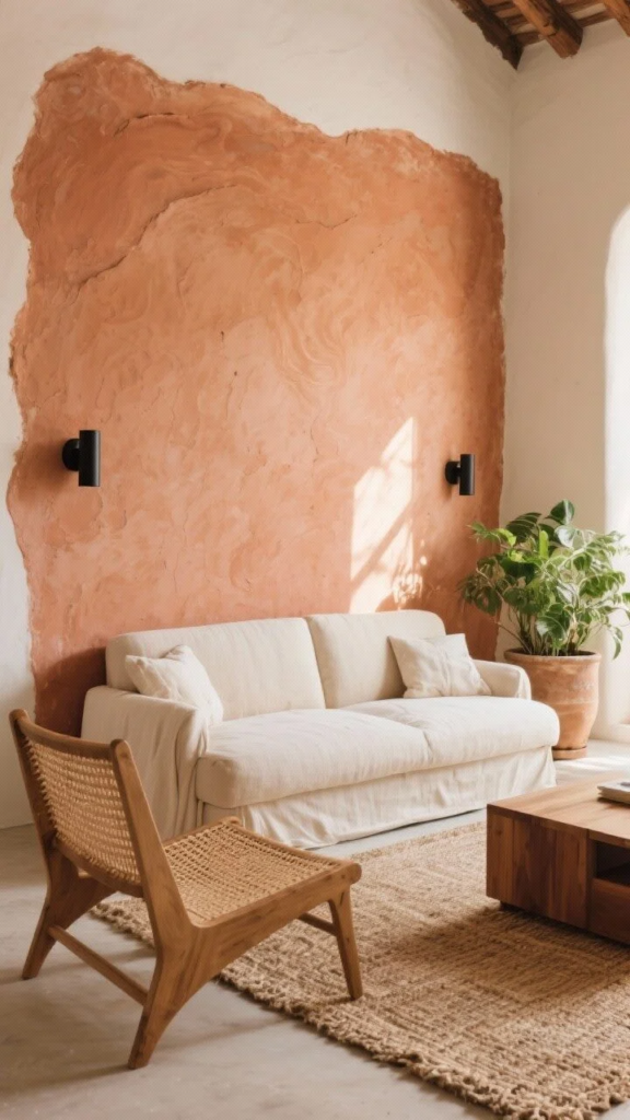 Warm up your room with a terracotta Venetian plaster accent wall that looks beautifully sun-washed. The soft movement in the plaster adds depth without being busy.