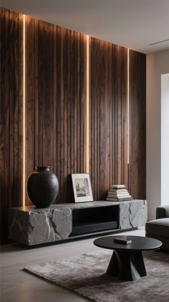 Go minimalist with a stone-look media console, a graphite sectional, and a sculptural black coffee table. Use linear LED backlighting behind the slats to create a soft halo at night. Keep accessories minimal—one oversized vase, one art book stack, done.