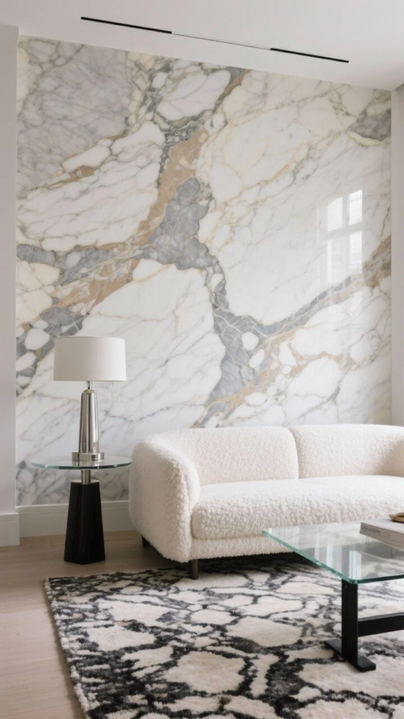 Turn your wall into art with a marble-look mural—think oversized veining in gray, cream, and hints of taupe. It’s luxurious without being too formal.