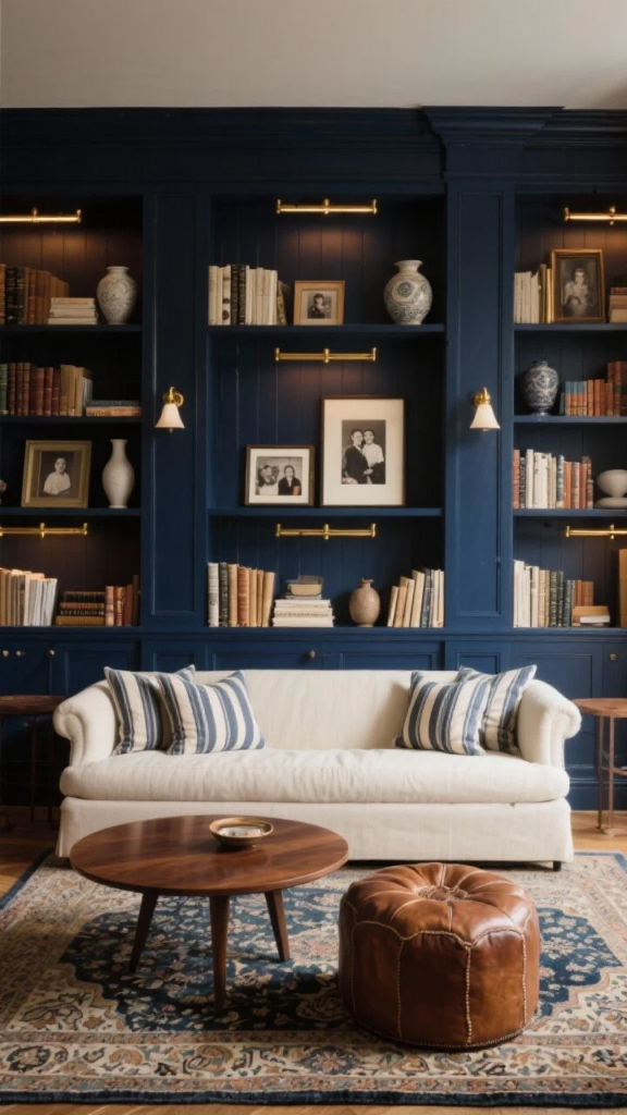 If you love books, build your accent wall with navy built-in shelves and brass picture lights. It’s classic library vibes, but chic.
