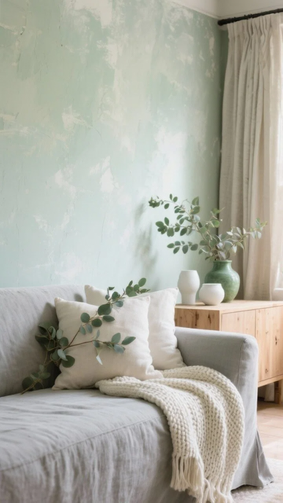 Mix in linen drapes, a light gray slipcover sofa, and a natural wood sideboard. Keep the palette soft: pale eucalyptus pillows, a cream knit throw, and matte pottery in whites and greens.