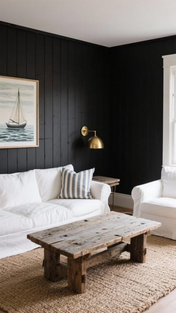 Balance with white slipcovered seating, a reclaimed wood coffee table, and nautical but subtle art. A jute rug and brass dome sconces soften the contrast. Add one striped pillow to nod to the coastal vibe without going theme-y.