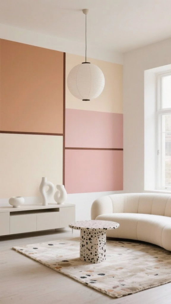 Paint your accent wall with large color-blocked shapes—soft clay, warm beige, and dusty rose with a thin espresso outline. It’s playful and artsy without commitment to wallpaper.