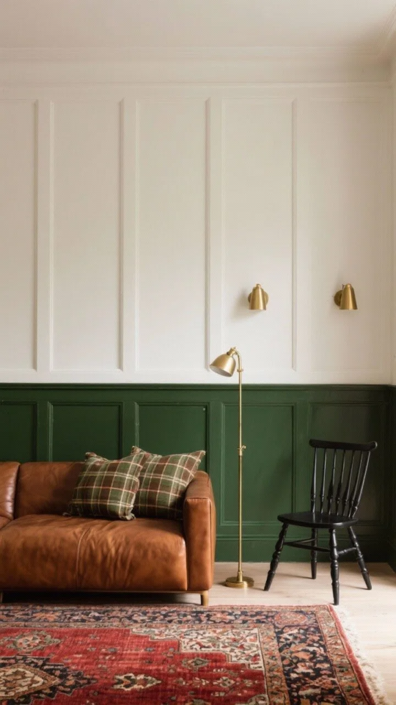 Split the wall with box wainscoting in a moody moss green on the bottom and warm white above. It shapes the room and feels tailored.