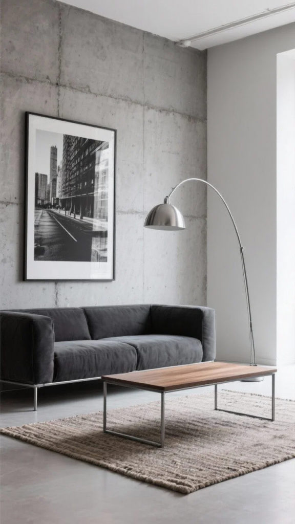 Bring in a charcoal sectional, a steel-frame coffee table with a wood top, and a flat-woven rug. Add an oversized black-and-white photograph and an arc floor lamp in brushed steel for drama.
