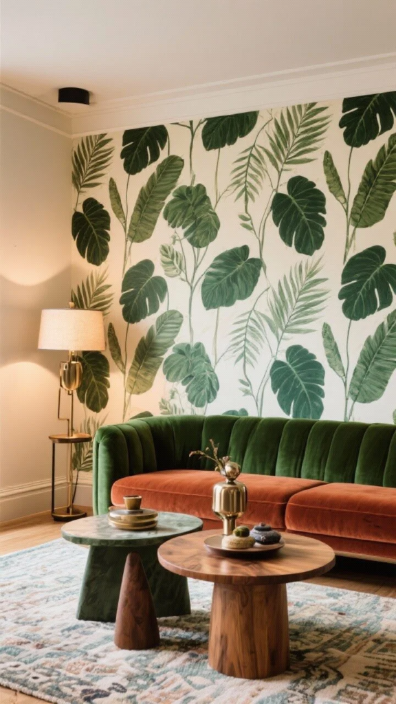 Complete the look with a velvet sofa in forest green or rust, a round wood coffee table, and layered lighting. Use mixed metals and a soft patterned rug to keep it eclectic-but-curated.