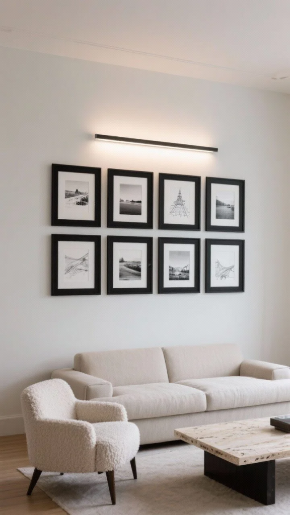 Turn your accent wall into a curated moment with a grid gallery wall. Use identical black frames with white mats for a striking, organized look.