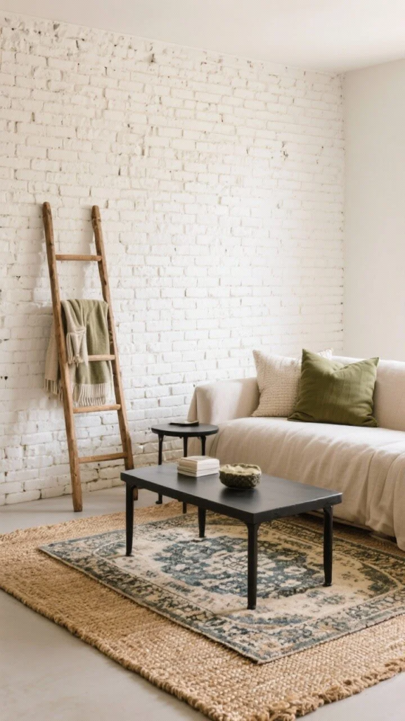 Style with a linen sofa, black metal side tables, and a layered rug combo: sisal under a patterned vintage rug. Add olive-toned pillows and a wooden ladder for throws to go rustic without going farmhouse.
