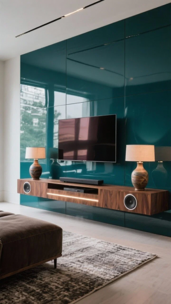 Make your media wall chic with high-gloss lacquer in deep teal or oxblood. The shine reflects light and makes your tech look intentional.