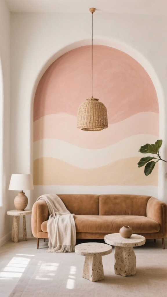Paint a soft arched mural behind your sofa in an ombre wash—from pale blush at the base to warm beige at the top. It frames the seating and adds architectural charm.