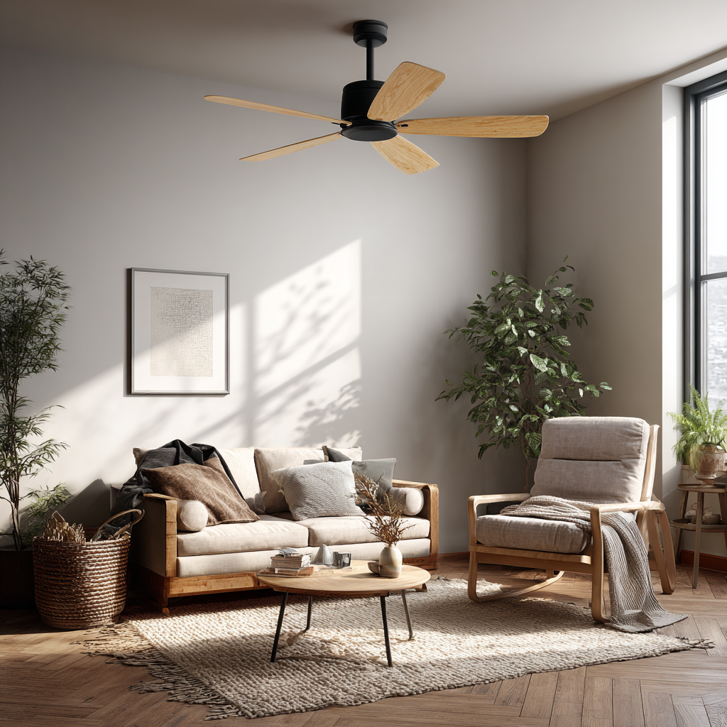 Natural wood tones – from light maple to rich walnut – add instant warmth and texture. These work beautifully in mid-century modern, Scandinavian, or even modern farmhouse designs. It’s less about the motor housing and all about the blades.