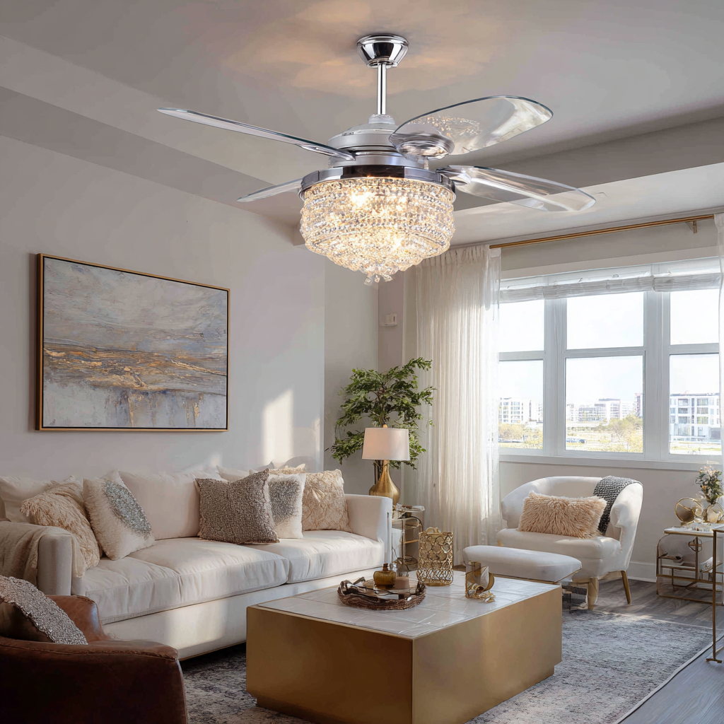 Yes, “fandeliers” are a thing! They combine the function of a ceiling fan with the sparkle of a chandelier. Often featuring crystal droplets, polished chrome or brass, and hidden blades, they add a touch of luxury.
