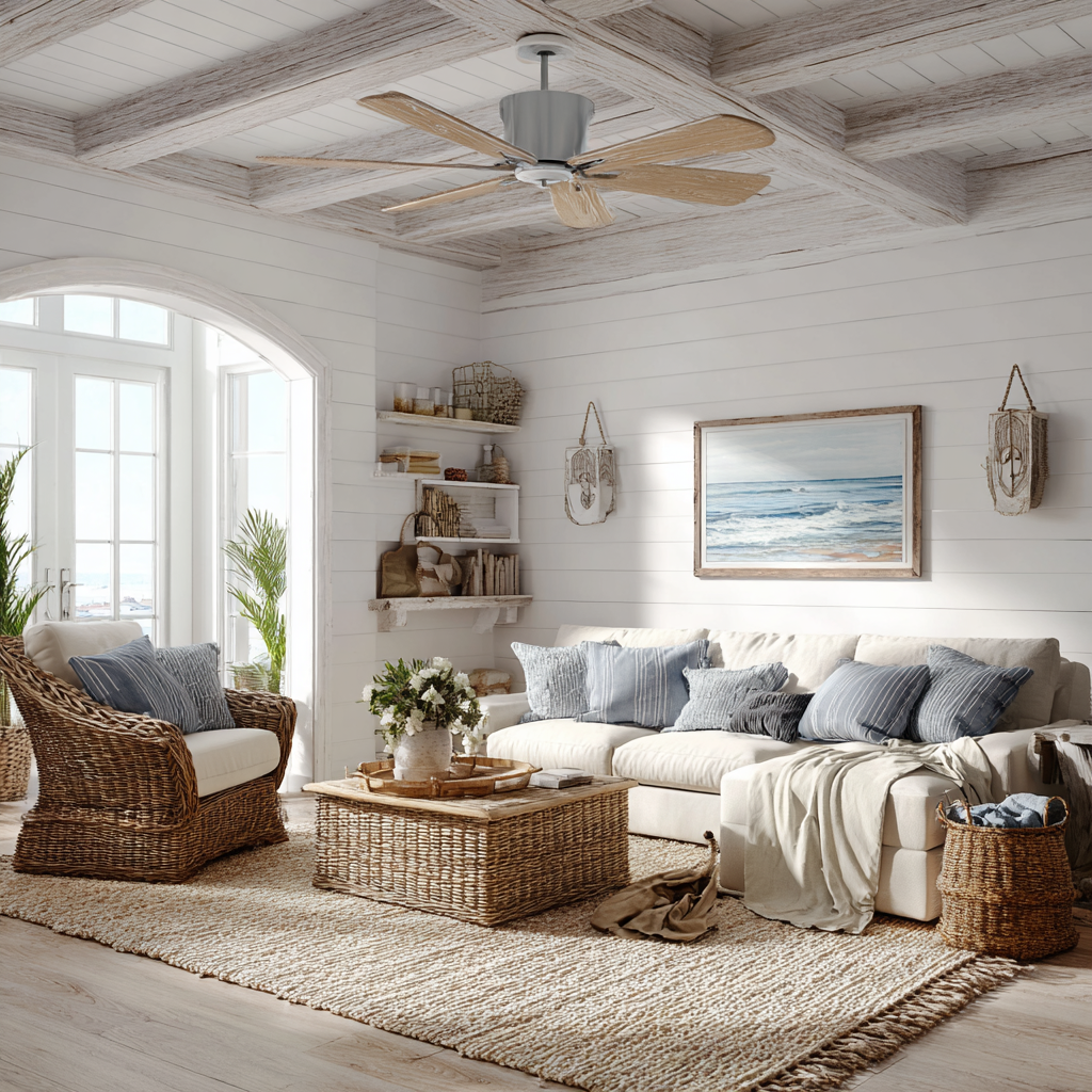 Think light, airy vibes: white finishes, light-toned wood blades (maybe resembling driftwood), and sometimes subtle nautical details like canvas-look blades or lantern-style lights.