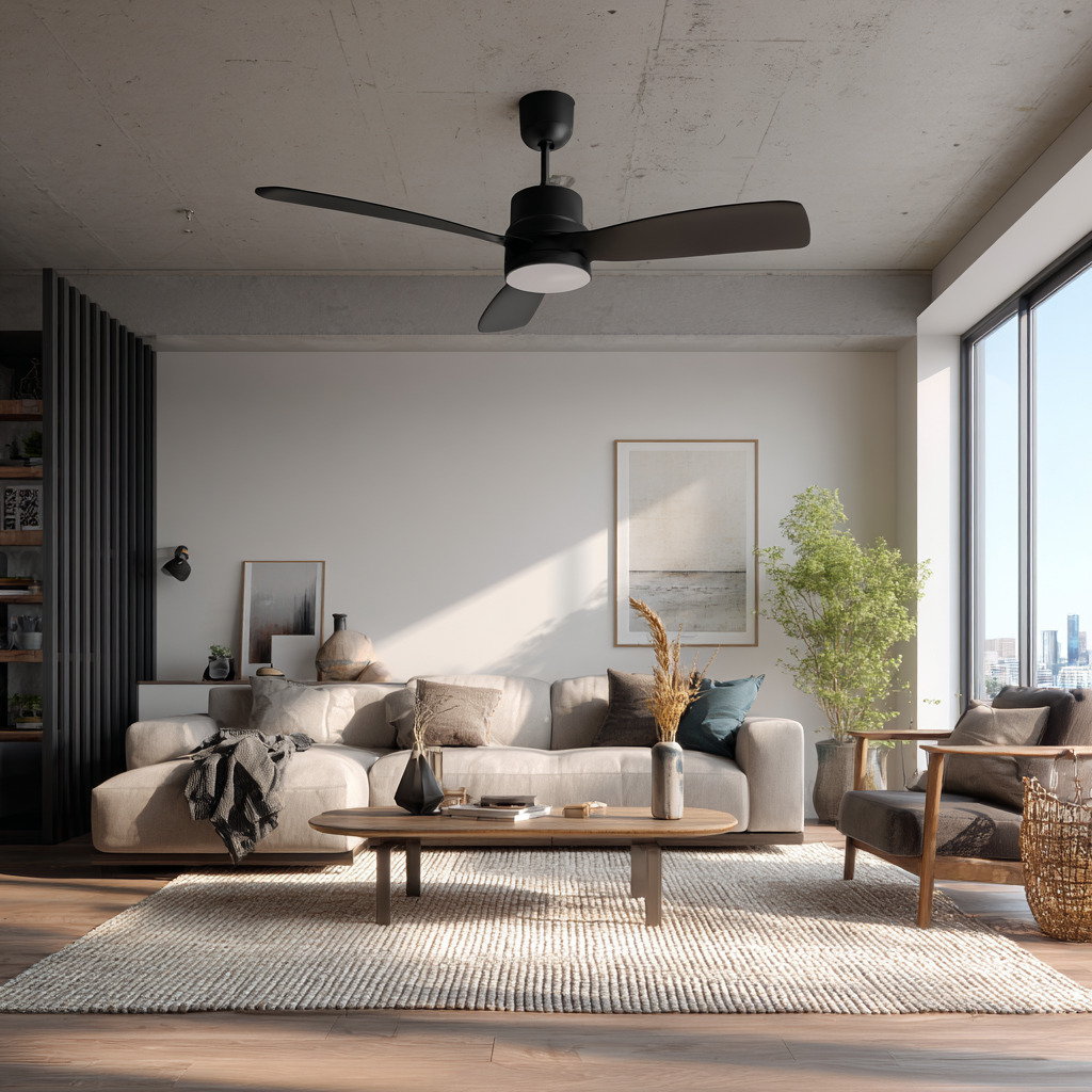 A matte black fan provides a strong graphic element and contrasts beautifully against lighter ceilings. It feels sophisticated and modern without trying too hard.
