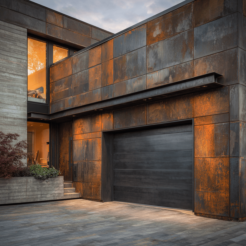 It starts as a standard steel color and evolves into rich, textured shades of orange, brown, and red. Think rugged sculptures or industrial buildings – but on your garage.