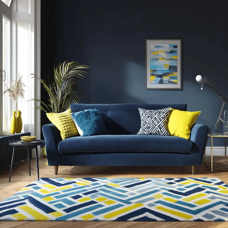 The bold lines and shapes in the rug contrast beautifully with the deep, rich navy of the couch.