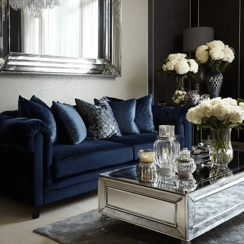 A navy sofa pairs beautifully with a mirrored coffee table. The deep blue of the sofa stands out against the reflective surface, creating a striking focal point.