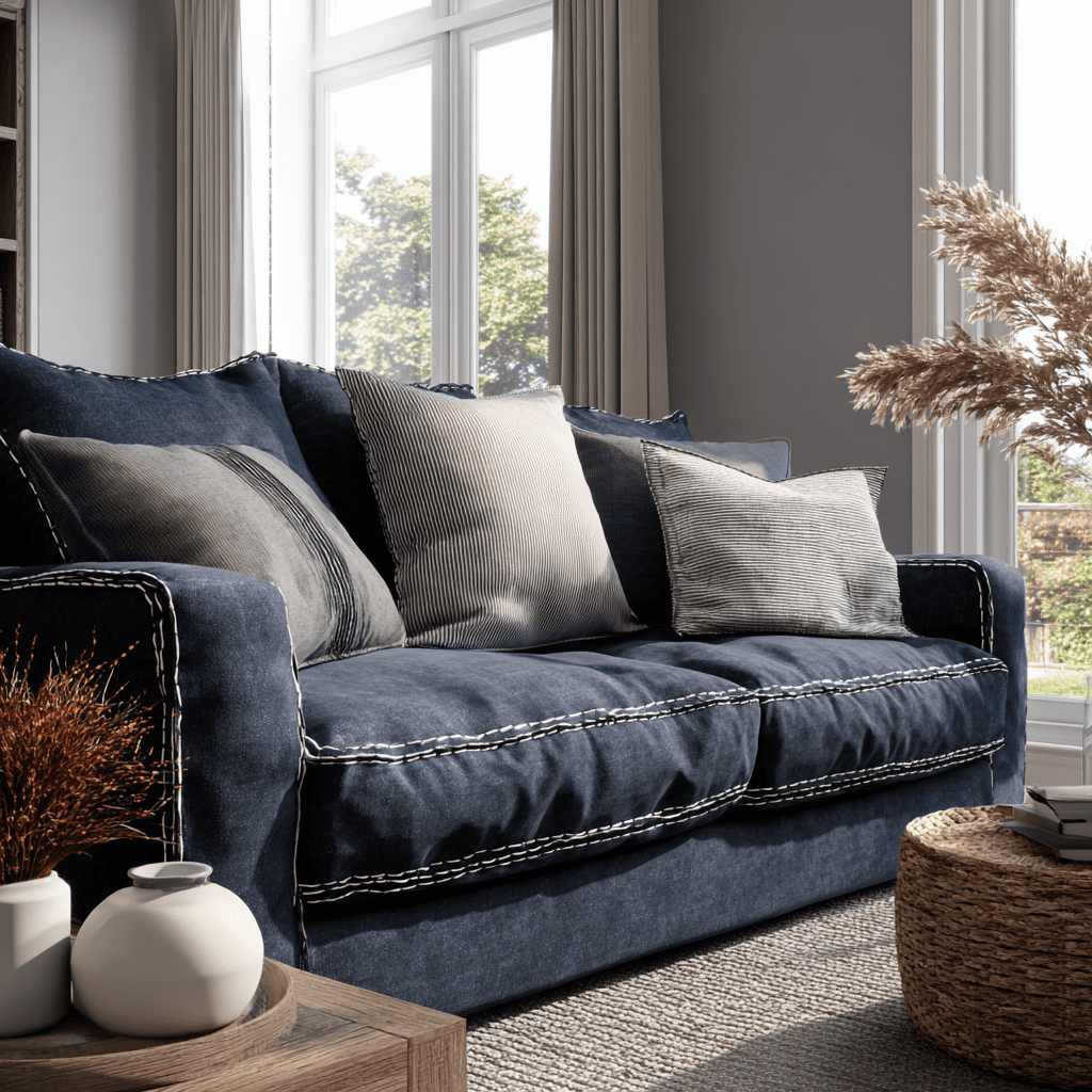 A navy denim sofa with contrasting stitching brings a unique flair to a living room. The denim fabric gives the couch a casual yet durable feel, while the stitching adds a touch of detail that catches the eye.