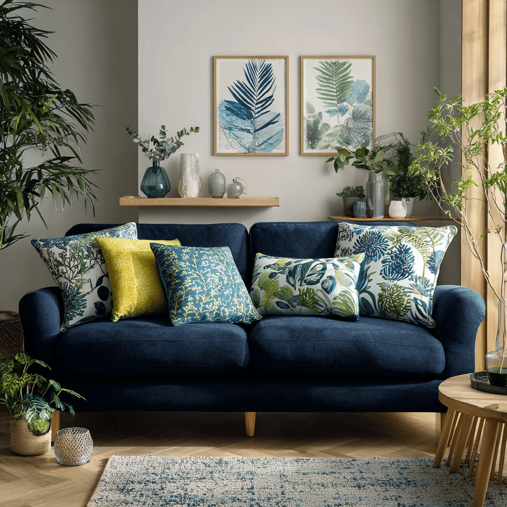 A navy sofa paired with botanical-themed cushions creates a fresh and inviting space, blending nature with a sophisticated touch. The deep blue of the sofa acts as a perfect canvas for the colorful cushion designs.