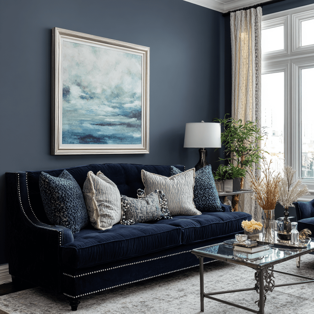 A navy blue couch pairs well with a variety of colors. Neutral tones like white, beige, and gray create a balanced and sophisticated look. Walls painted in light gray or off-white help the deep blue of the sofa stand out without overwhelming the room.