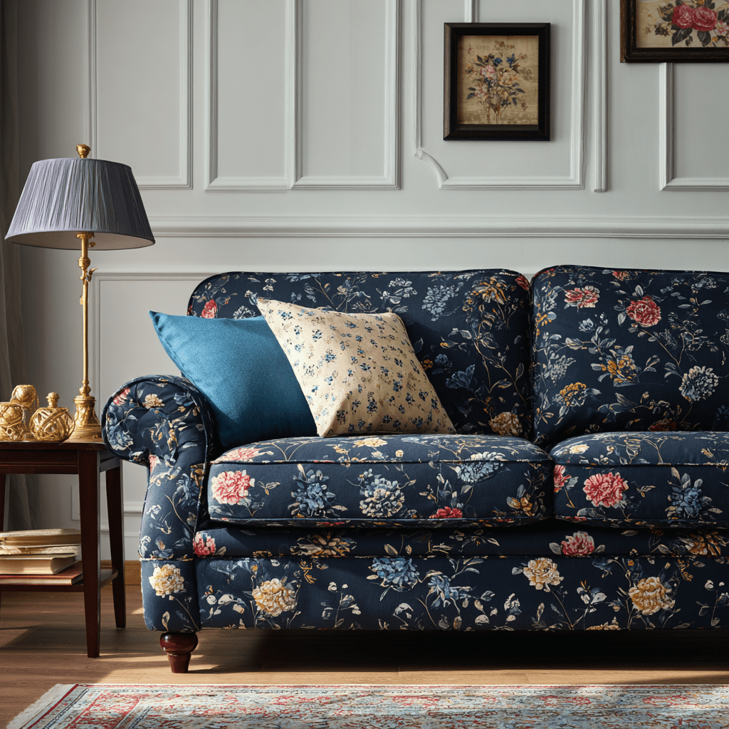 A roll-arm navy sofa with floral patterns can add a charming and classic touch to a living room. The floral designs create a lively atmosphere, while the navy color adds depth and sophistication.