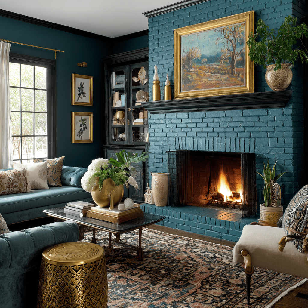 Try pairing teal with brass or gold accents for a luxe look. You can paint the mantel and surround teal while keeping the hearth neutral. Or go bold and paint the entire fireplace structure.
