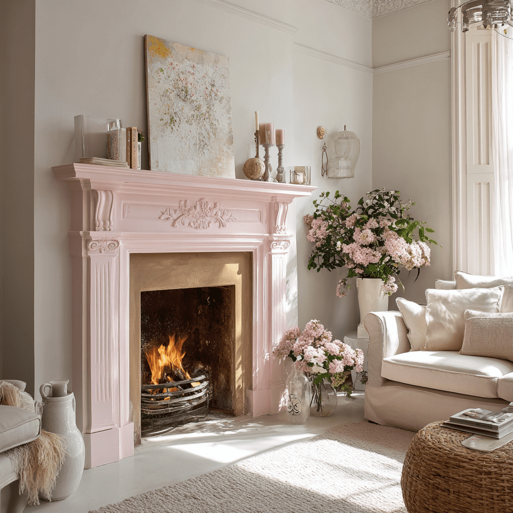 For a cohesive look, pair the blush fireplace with neutral walls and furnishings. Add gold or brass accents to enhance the warm, inviting atmosphere.