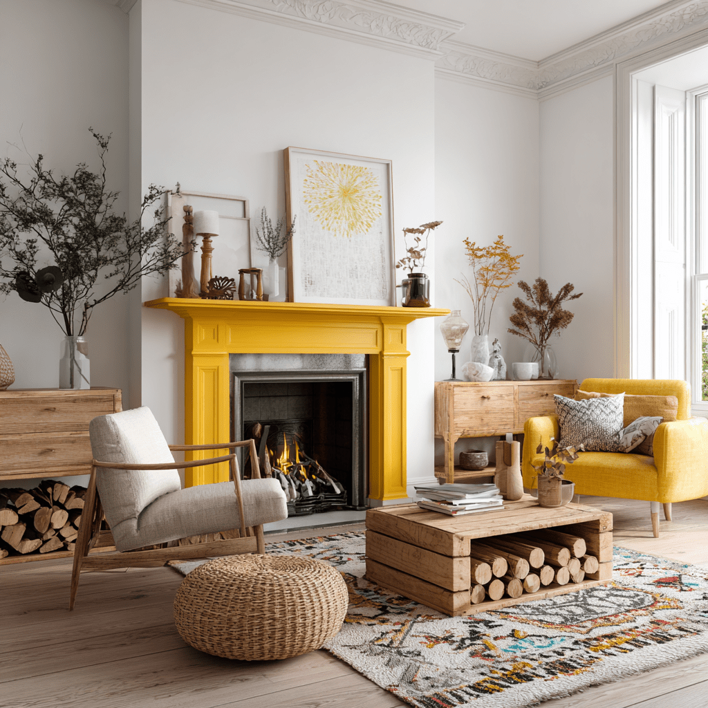 A bright yellow painted fireplace can bring cheer to any room. This bold choice creates a sunny focal point that stands out against neutral walls.