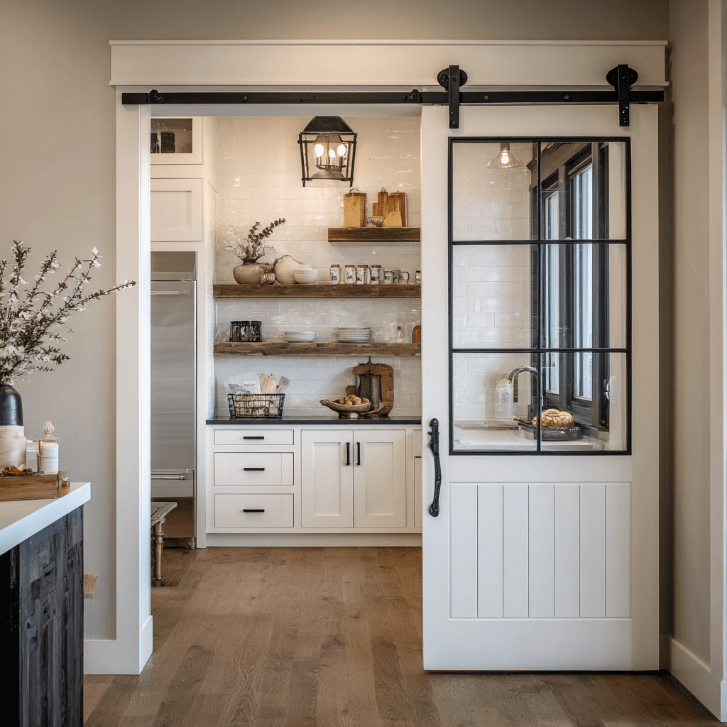 A Dutch door—split horizontally with independent operation—offers unique functionality for pantry access. The glass-paned top section can remain open for easy passing of items while the bottom stays closed to contain pets or toddlers.
