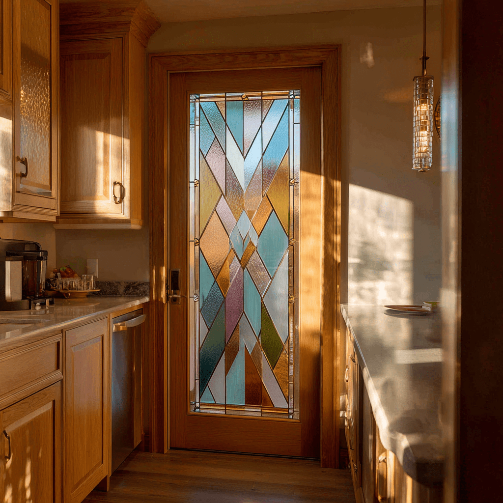 For personalized elegance, consider a custom leaded glass design for your pantry door. This traditional technique joins small glass pieces with lead came to create intricate patterns reminiscent of fine English manors.