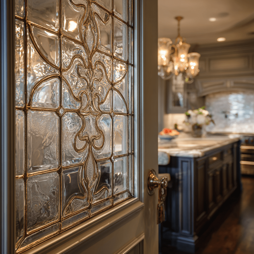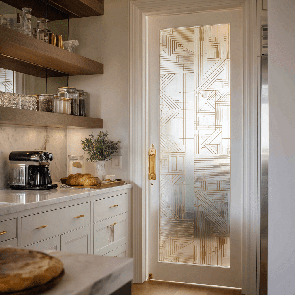 I replaced my plain pantry door with a frosted panel featuring subtle vine etching—it completely transformed the kitchen’s ambiance.