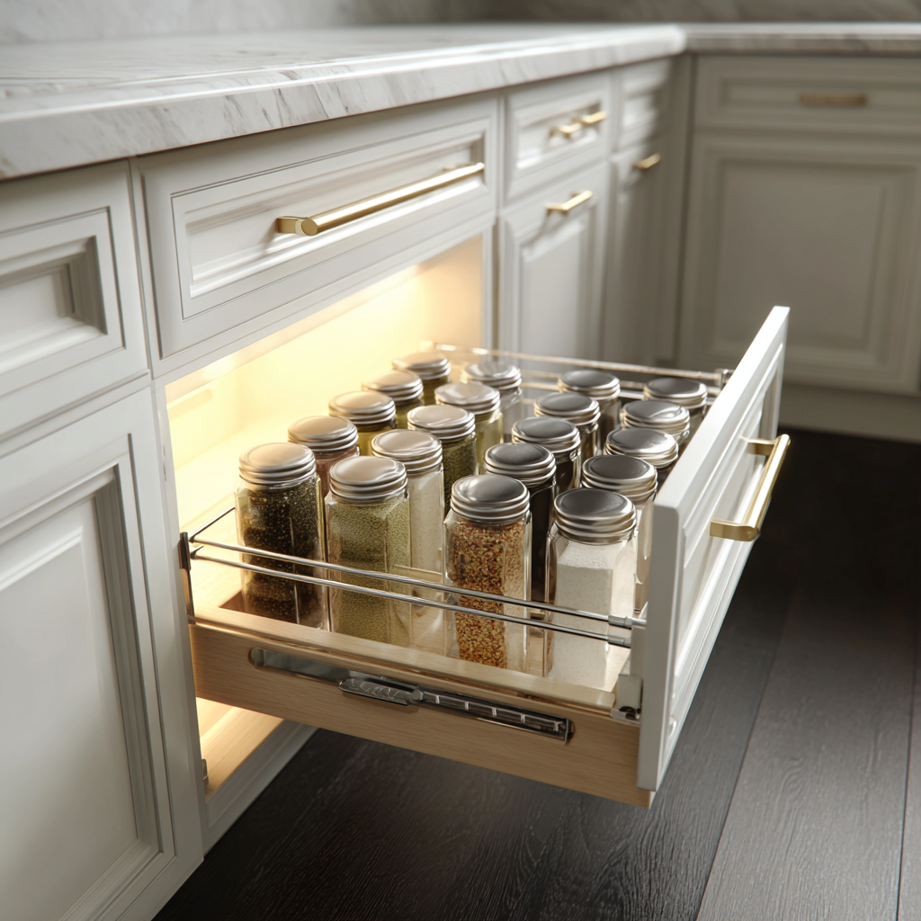 A slim spice pull-out keeps tiny bottles from getting lost. It slides out easily and shows every label at a glance. No more buying the same paprika twice.