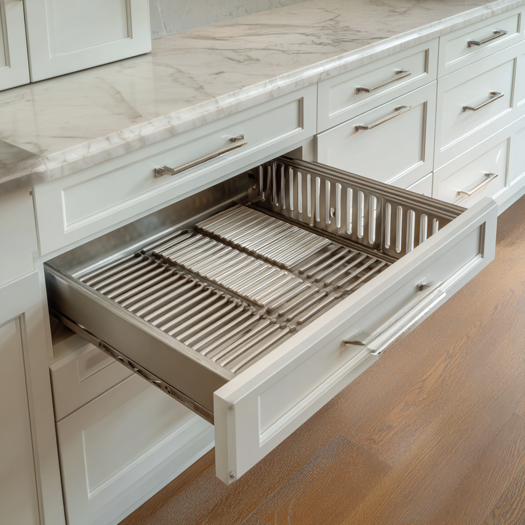 A multi-compartment drawer unit bundles small, medium, and large sections in one pull-out. It’s the ultimate all-in-one organizer.