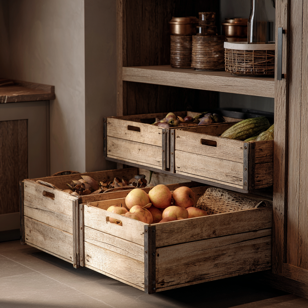 A wooden crate pull-out brings a warm, rustic vibe while keeping produce or packaged goods accessible. It glides smoothly and hides clutter beautifully.