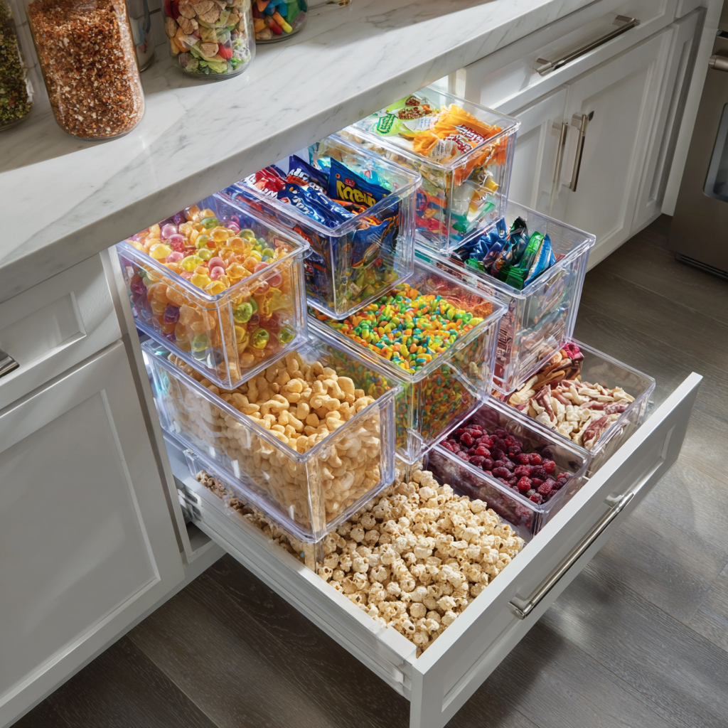 This layout boosts visibility and makes snacking more intentional. It keeps your pantry fun, tidy, and easy for everyone to use.
