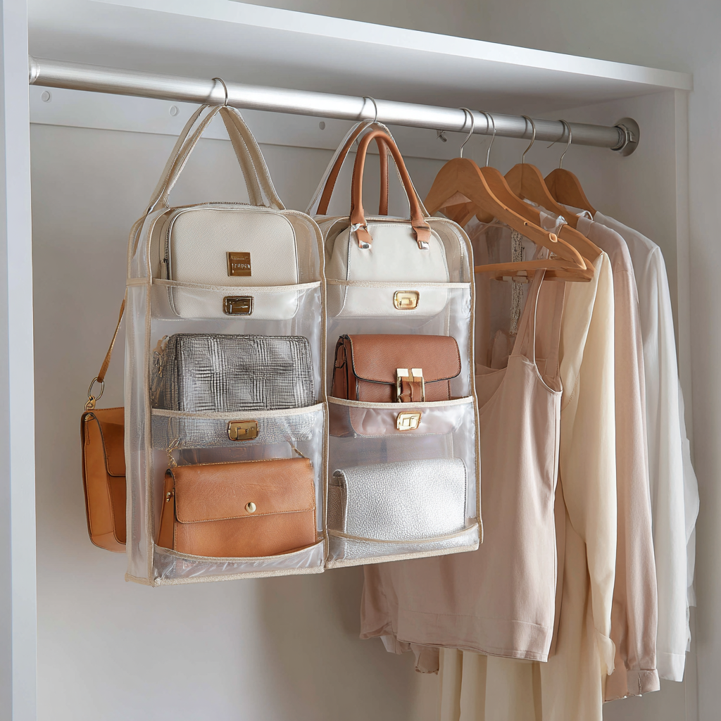 A hanging purse organizer lets you store several bags vertically without taking up shelf space. It usually comes with clear pockets or adjustable hooks so you can see each purse at a glance.