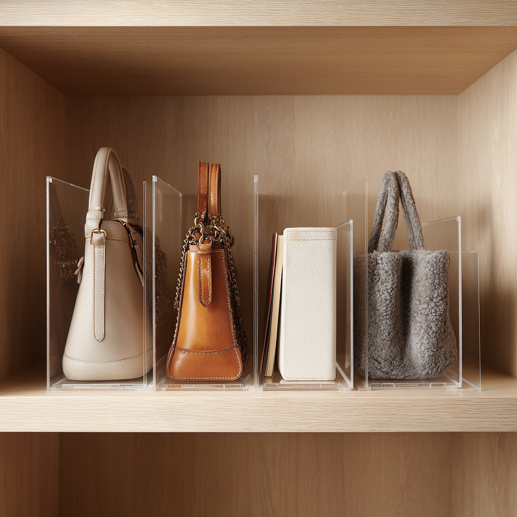 Adjustable shelf dividers turn any basic shelf into a neat lineup of perfectly separated handbags. They keep bags upright and stop them from sliding into a messy pile.