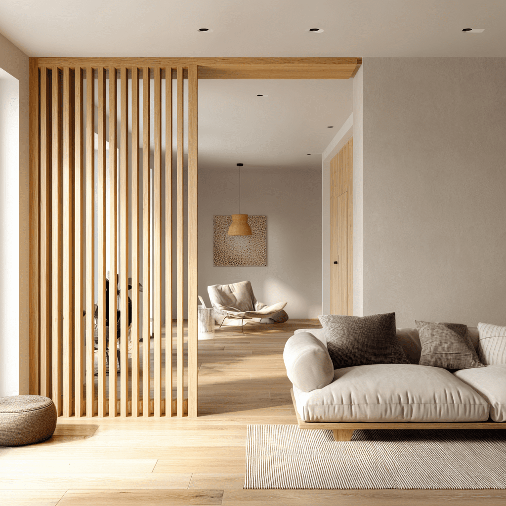 Wood slat dividers are everywhere for a reason. They separate space without blocking light, and they look insanely high-end.