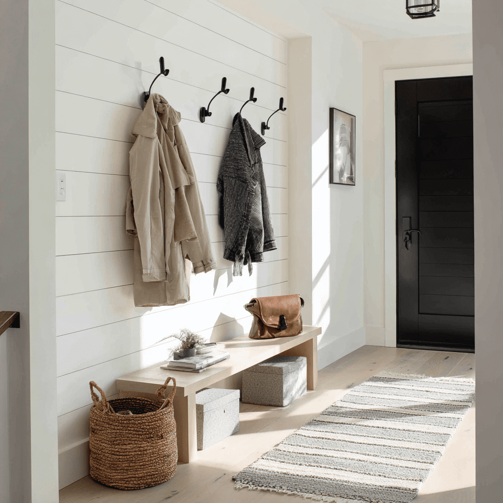 This idea blends style and function in the best way. A shiplap wall with mounted hooks keeps coats, bags, and hats off the floor while looking intentional.