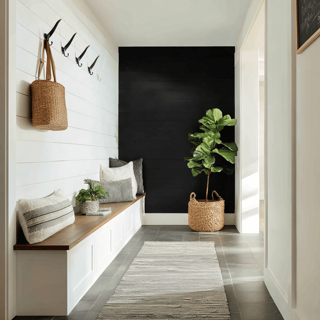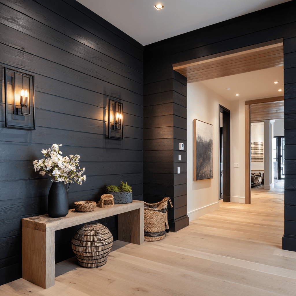 Dark shiplap feels bold, cozy, and high-end. Think charcoal, navy, or deep forest green. It instantly adds drama to a plain entryway.