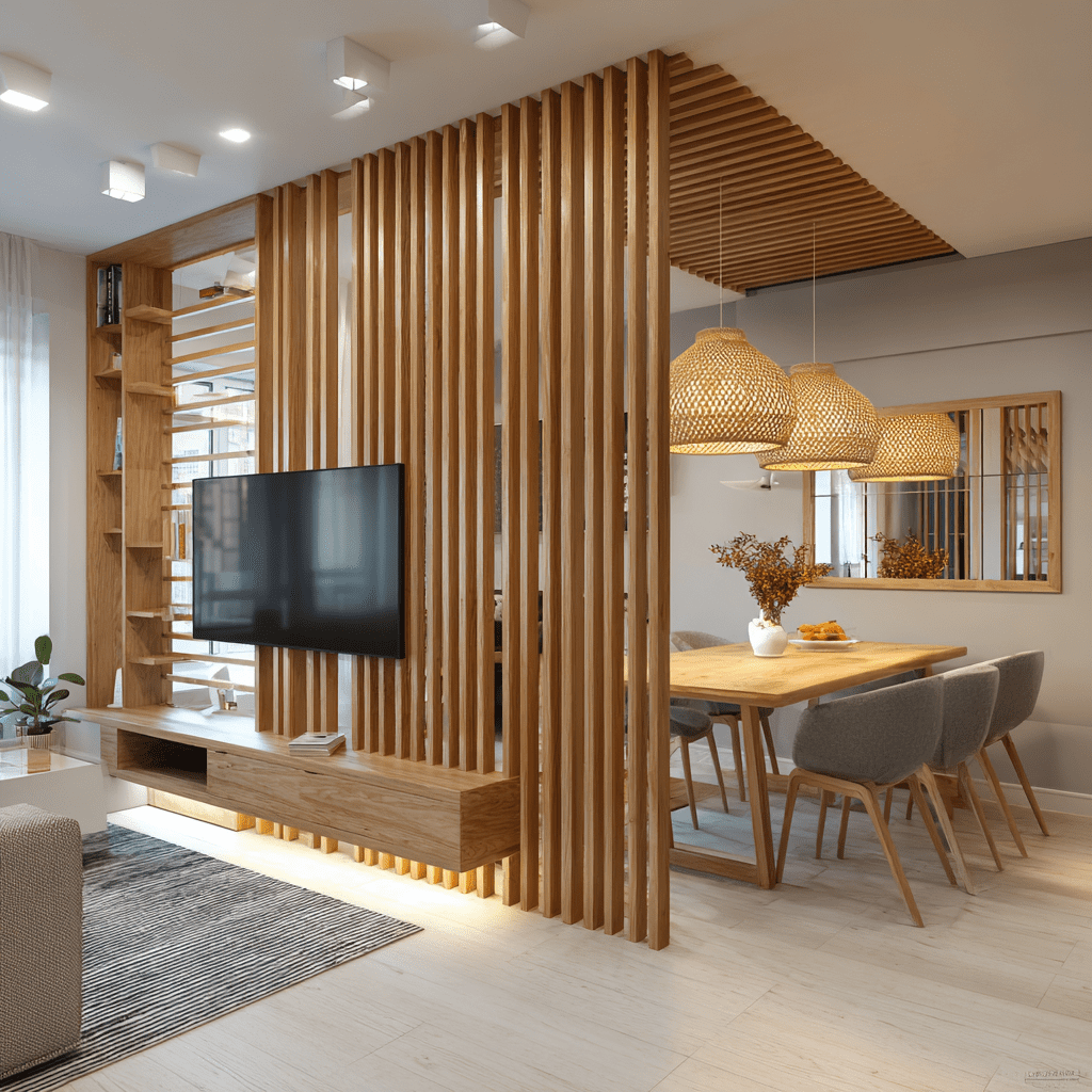 A lightweight partition between the TV and dining area creates structure without closing the room off. Think open shelves, wooden slats, or glass panels.