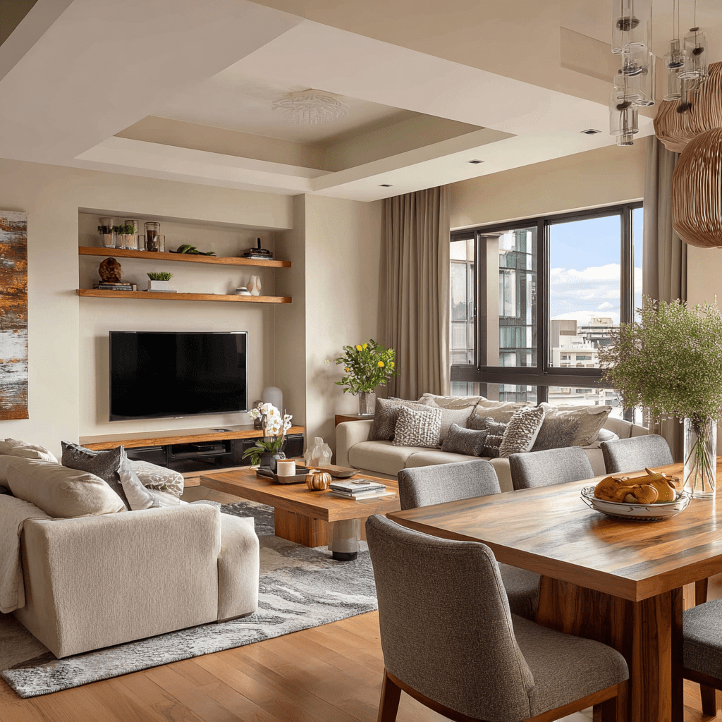 It’s a stylish win for small living room ideas with TV and dining table setups.
